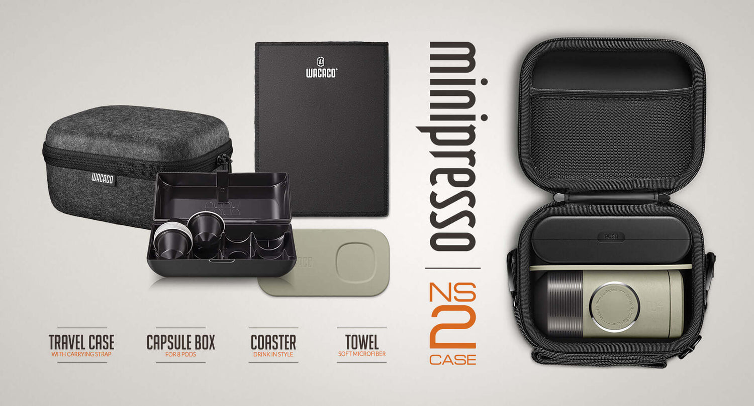 Whether flying overseas or cycling to work, the MINIPRESSO NS2 CASE protects your compact Minipresso NS 2.0 capsule espresso machine. You can also pack up to eight coffee capsules tidily in the rigid box provided, enough coffee to last a trip to almost any destination. The Minipresso NS2 CASE comes with an additional coaster and a soft towel. All you need for the best espresso experience.